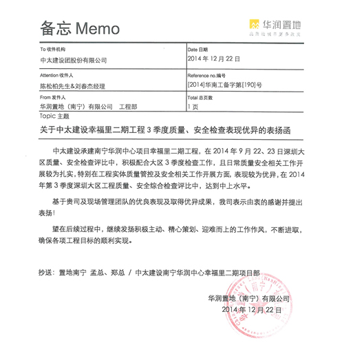 信函提到,在9月22日、23日深圳大區(qū)質(zhì)量、安全檢查評(píng)比中,中太建設(shè)集團(tuán)積極配合大區(qū)三季度檢查工作,且日常質(zhì)量安全相關(guān)工作開展較為扎實(shí),特別在工程實(shí)體質(zhì)量管控及安全相關(guān)工作開展方面表現(xiàn)優(yōu)異,并在評(píng)比中達(dá)到中上水平。