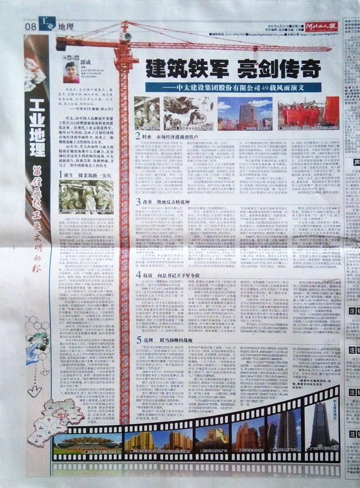 “人馬未歇的中太扛著‘打中太牌、走全國路、謀海外財’的軍旗,一路高歌猛進,全力征戰(zhàn)國內外建筑市場。無論是平沙莽莽黃入天的新疆戈壁,風吹草低見牛羊的內蒙草原,還是吳儂軟語的江南水鄉(xiāng),群雄逐鹿的人文中原,抑或北非地中海沿岸等地到處都活躍著中太人的身影。”中太總裁張明禮娓娓道來。
