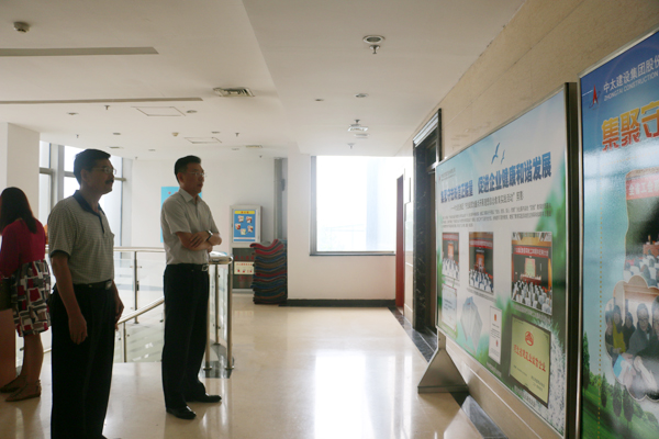 7月23日下午,由省工商聯(lián)副主席常衛(wèi)華帶隊(duì)的督導(dǎo)組,在廊坊市委統(tǒng)戰(zhàn)部副部長(zhǎng)、工商聯(lián)黨組書(shū)記劉玫等領(lǐng)導(dǎo)的陪同下,來(lái)到中太建設(shè)集團(tuán)調(diào)研以守法誠(chéng)信為重點(diǎn)內(nèi)容的深入開(kāi)展理想信念教育實(shí)踐活動(dòng)情況,聽(tīng)取了集團(tuán)公司黨委副書(shū)記、工會(huì)主席鐘崇鶴關(guān)于集團(tuán)公司開(kāi)展以誠(chéng)信守法為為重點(diǎn)內(nèi)容的理想信念教育實(shí)踐活動(dòng)情況的匯報(bào),觀看了活動(dòng)宣傳展板、并參觀了集團(tuán)公司二樓陳列室和十五樓榮譽(yù)室。