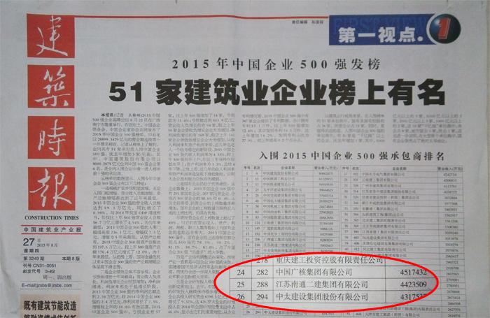 建筑時報8月27日報道了中太建設(shè)集團(tuán)入圍2015年中國企業(yè)500強(qiáng),在入圍的建筑承包商中排名第26位