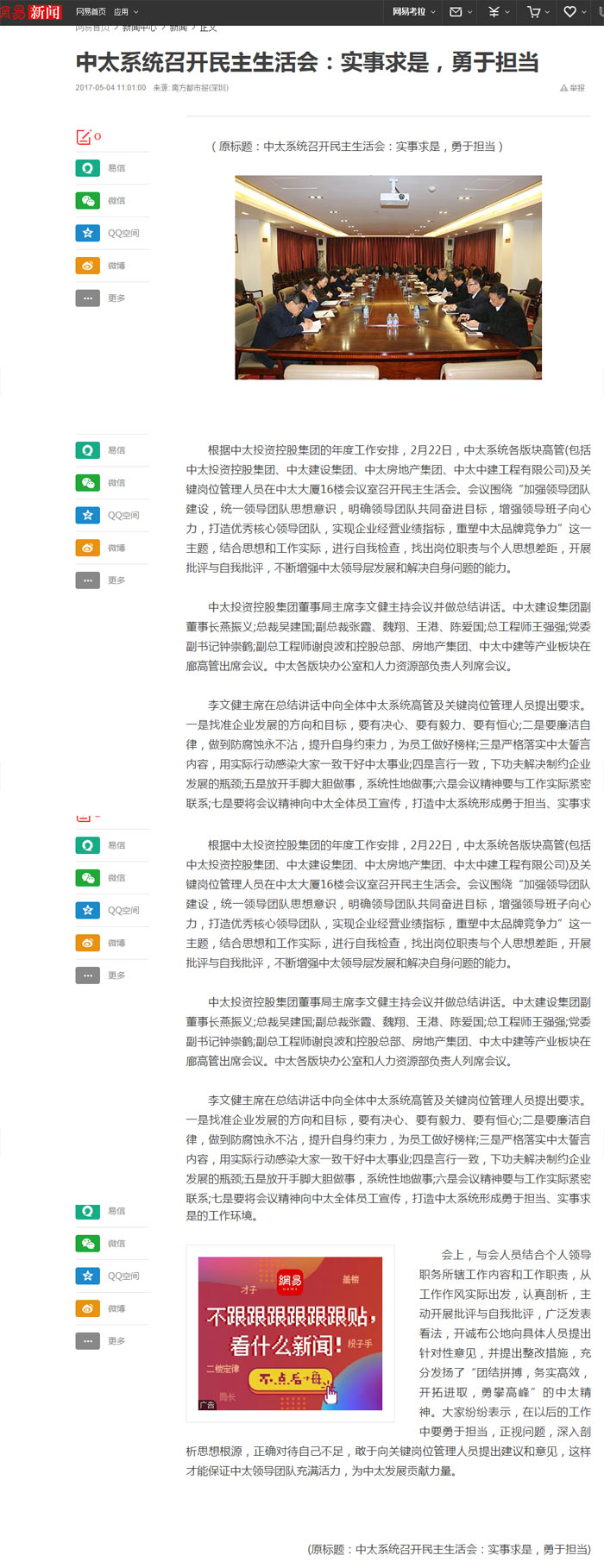 網(wǎng)易新聞報道了“中太系統(tǒng)召開民主生活會:實事求是,勇于擔(dān)當(dāng)”