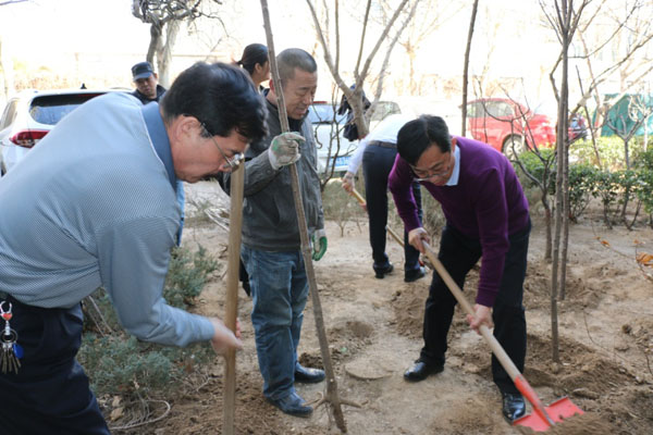 在植樹現(xiàn)場,大家互相配合,有的揮鍬鏟土、有的扶樹填土、有的培土澆水,進行挖坑、栽植、澆水、夯實、圈維等具體操作,忙得不亦樂乎。經(jīng)過一個多小時的勞動,一株株樹苗都已“安家落戶”,為小區(qū)建設添上了一片新綠。