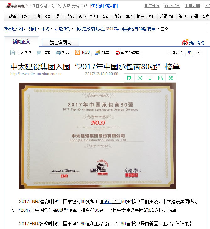 新浪網(wǎng)報道了“中太建設(shè)集團(tuán)入圍“2017年中國承包商80強(qiáng)”榜單”