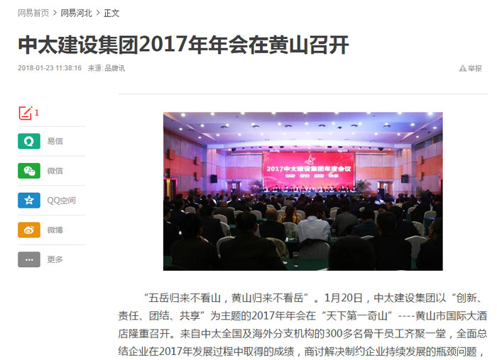 網(wǎng)易報道了“中太建設(shè)集團(tuán)2017年年會在黃山召開”