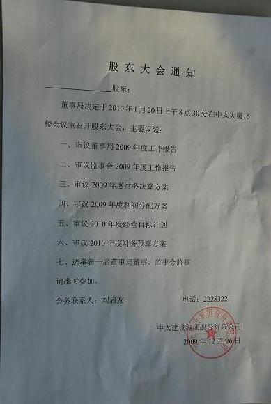 經董事局研究決定,中太建設集團將于2010年元月20日上午8點30分在中太大廈16樓會議室召開股東大會。