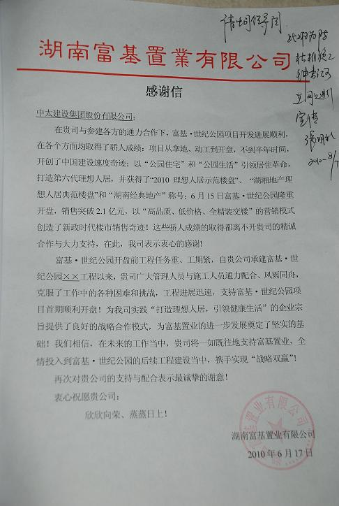 感謝信中說(shuō),6月15日,富基.世紀(jì)公園隆重開盤,銷售突破2.1億元,這些驕人成績(jī)都離不開中太集團(tuán)的精誠(chéng)合作與大力支持。同時(shí)他們表示,雙方將在項(xiàng)目的后續(xù)工程建設(shè)中,相互支持,攜手實(shí)現(xiàn)“戰(zhàn)略雙贏”。 |