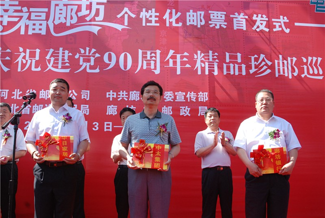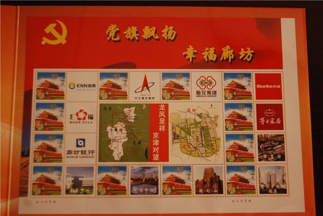 6月3日上午,由廊坊市委宣傳部與廊坊市郵政局共同推出的《黨旗飄揚(yáng) 幸福廊坊》個性化郵票在廊坊市博物館舉行首發(fā)式。《黨旗飄揚(yáng)·幸福廊坊》個性化郵票共“1+12”幅圖案。“1”即中心主圖案,體現(xiàn)廊坊市“龍鳳呈祥,京津?qū)ν钡膮^(qū)位優(yōu)勢,“12”即12幅輔圖,其中4幅分別為會展中心、居民小區(qū)、文化藝術(shù)中心、中央生態(tài)城,體現(xiàn)“智能、生態(tài)、商務(wù)、休閑”的廊坊