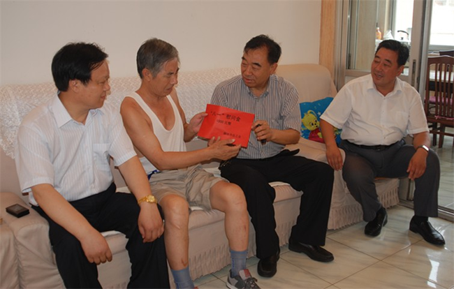 在八一建軍節(jié)到臨之際,7月27日上午,廊坊市人大副主任、市總工會(huì)主席王瑞峰(右二)、廊坊市總工會(huì)黨組書記、常務(wù)副主席關(guān)景發(fā)(右一),市總工會(huì)副主席王泰山在廊坊市建設(shè)局黨委委員、系統(tǒng)工會(huì)主任王克峰等領(lǐng)導(dǎo)同志的陪同下,來(lái)到集團(tuán)公司第一生活區(qū)家屬院,看望慰問(wèn)公司因病家庭困難的軍轉(zhuǎn)干部劉國(guó)清(左二),代表市總工會(huì)向劉國(guó)清表示節(jié)日慰問(wèn),并頒發(fā)了慰問(wèn)金。中太建設(shè)集團(tuán)黨委書記、董事局主席李文健(左一)陪同慰問(wèn)。 |