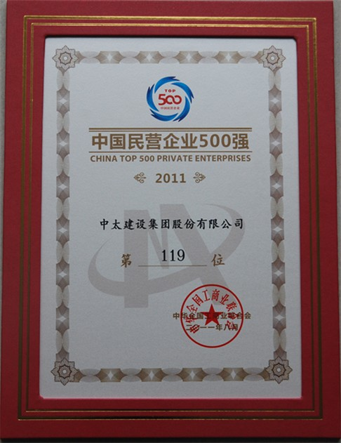 8月25日上午,全國(guó)工商聯(lián)在北京召開2011中國(guó)民營(yíng)企業(yè)500強(qiáng)發(fā)布會(huì),發(fā)布2011中國(guó)民營(yíng)企業(yè)500強(qiáng)、2011中國(guó)民營(yíng)企業(yè)制造業(yè)500強(qiáng)名單以及2011中國(guó)民營(yíng)企業(yè)500強(qiáng)分析報(bào)告。中太建設(shè)集團(tuán)以1,527,046萬元的營(yíng)業(yè)收入業(yè)績(jī),排名2011中國(guó)民營(yíng)企業(yè)500強(qiáng)第119位。在河北省民營(yíng)企業(yè)建筑業(yè)中位列第一。