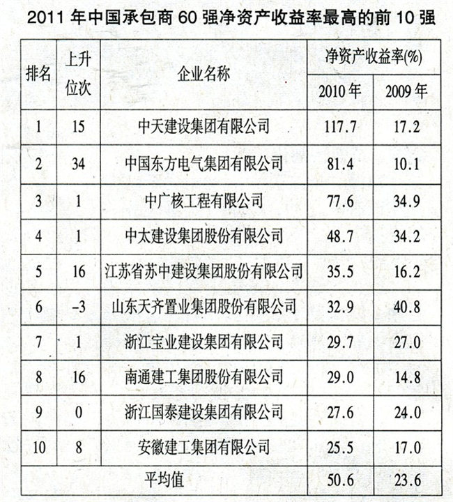 2011ENR/建筑時報“中國承包商和工程設(shè)計企業(yè)雙60強”榜單于11月16日正式發(fā)布。中太建設(shè)集團以2010年48.7%的凈資產(chǎn)收益率排名中國承包商60強第四位,較2009年34.2%的比率,排名上升了一位。