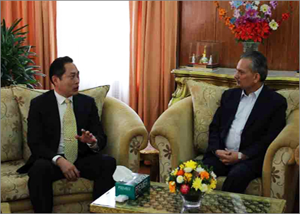 馬功云局長(左)拜訪尼泊爾總理,介紹中太建設集團發(fā)展情況。