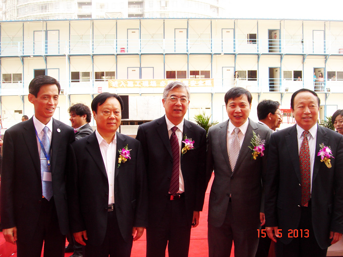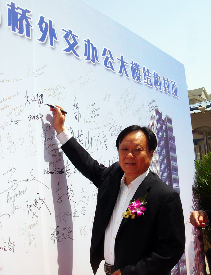 2013年5月15日上午,伴隨著最后一方混凝土的成功澆注,在50余名駐華外交使節(jié)以及外交部、北京市等有關(guān)部門代表的見證下,由集團公司第八工程局承建的亮馬橋外交辦公大樓工程正式實現(xiàn)主體結(jié)構(gòu)封頂。董事局主席李文健(左一)應(yīng)邀出席儀式。