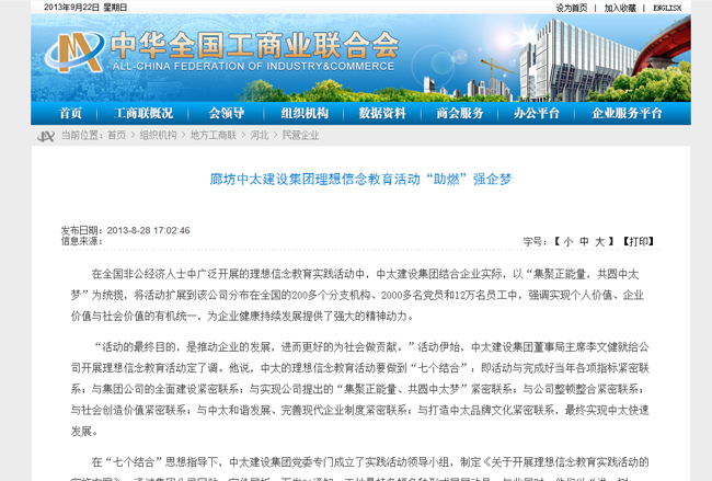 工商聯(lián)網(wǎng)站8月28日報道了中太建設(shè)集團理想信念教育活動“助燃”強企夢