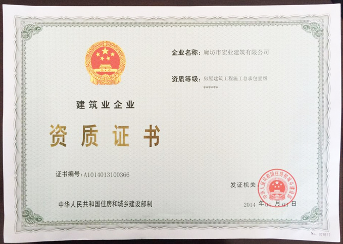 4月3日,經(jīng)國(guó)家住房和城鄉(xiāng)建設(shè)部核準(zhǔn),中太建設(shè)集團(tuán)股份有限公司控股子公司廊坊市宏業(yè)建筑有限公司正式晉升為房屋建筑工程施工總承包壹級(jí)資質(zhì)。
