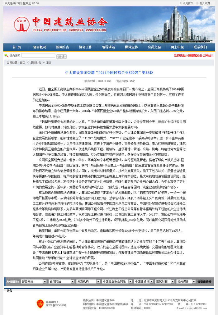 中國建筑業(yè)協(xié)會報道了中太建設(shè)集團(tuán)榮膺“2014中國民營企業(yè)500強(qiáng)”第68位