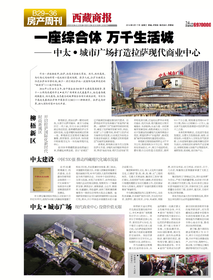 2014年4月18日上午,由中國企業(yè)500強(qiáng)中太建設(shè)集團(tuán)投資、第十一工程局承建的中太·城市廣場項目正式奠基開工,標(biāo)志著西藏規(guī)模最大、檔次最高、業(yè)態(tài)最全的城市綜合體項目赫然出現(xiàn)。項目位于高速發(fā)展的拉薩都市商務(wù)區(qū)(CBD)——柳梧新區(qū)。拉薩走向世界,融入國際的窗口由此開啟。
