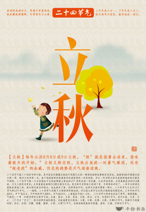 今天是立秋,意味著夏季的結(jié)束,秋季的開始,氣溫逐漸下降,雨水逐漸減少。我國幅員遼闊,就節(jié)氣而言不可能同時進入涼爽的秋季的,是有一些差別的。生活在廊坊這個地方,四季分明的氣候,是老天恩賜的福分。不冷不熱的天,氣候宜人,真正是秋高氣爽。我國古代將秋季劃分為三候:一候涼風至,二候白露生,三候寒蟬鳴。是說立秋后刮風人們會感到?jīng)鏊蟮卦绯繒徐F氣產(chǎn)生,并且秋天感陰而鳴的寒蟬也開始鳴叫。民間流行“貼秋膘”,就是在立秋這天吃些美味佳肴,老百姓家就是燉肉、包餃子。